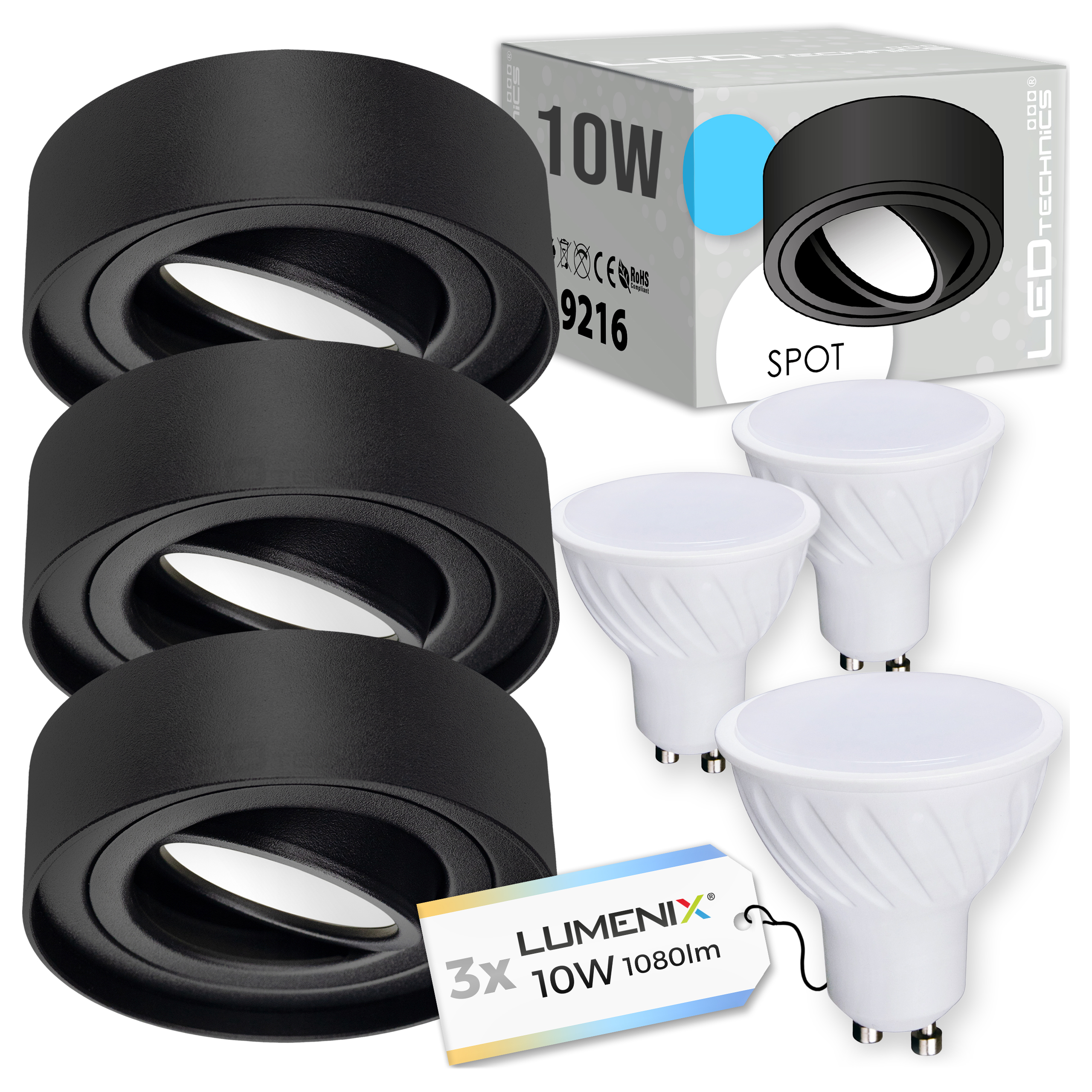 3x Ruchoma oprawa podtynkowa czarna + żarówka GU10 10W + gniazdo GU10
