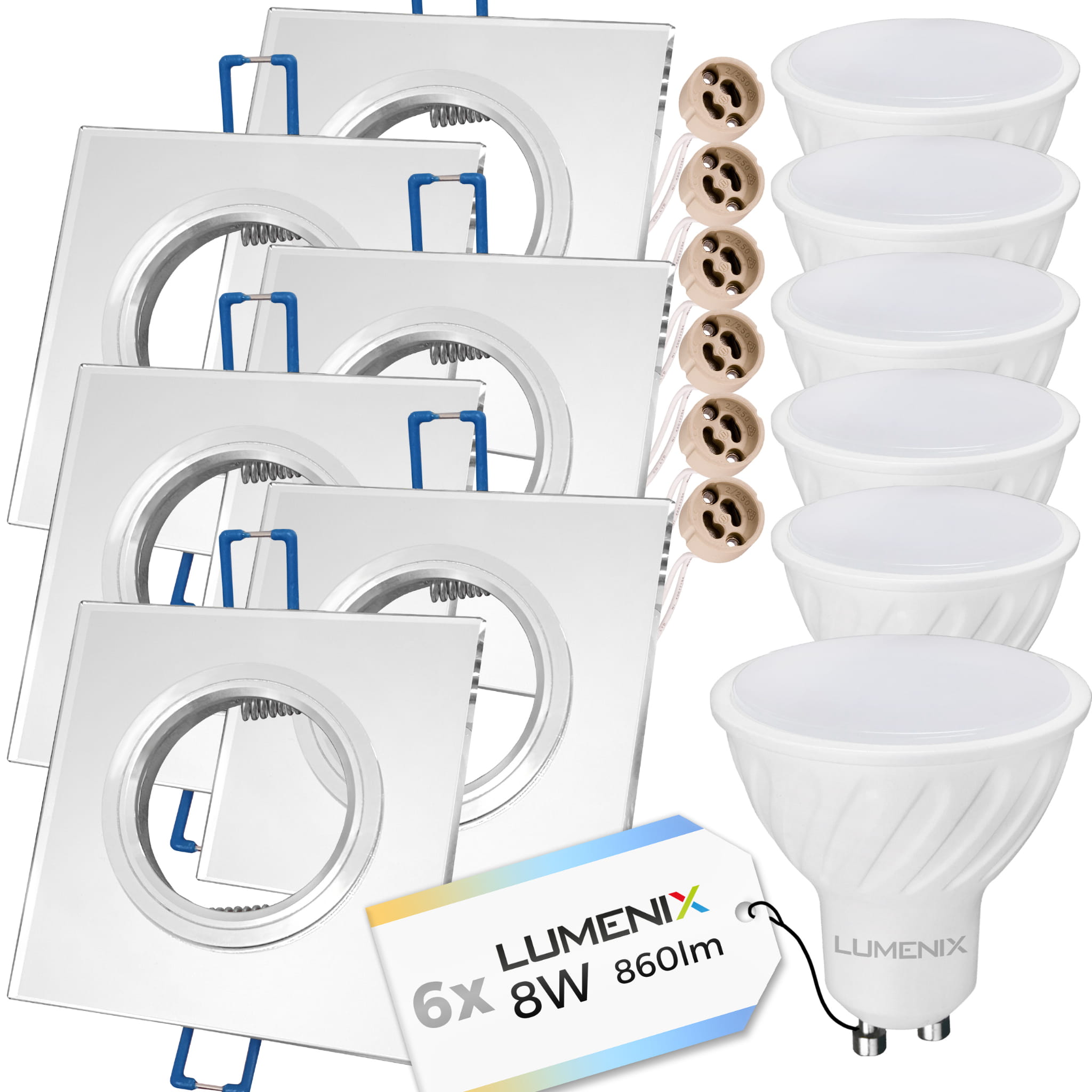6x Zestaw oprawa kwadrat szklana lustrzana + GU10 8W + gniazdo GU10
