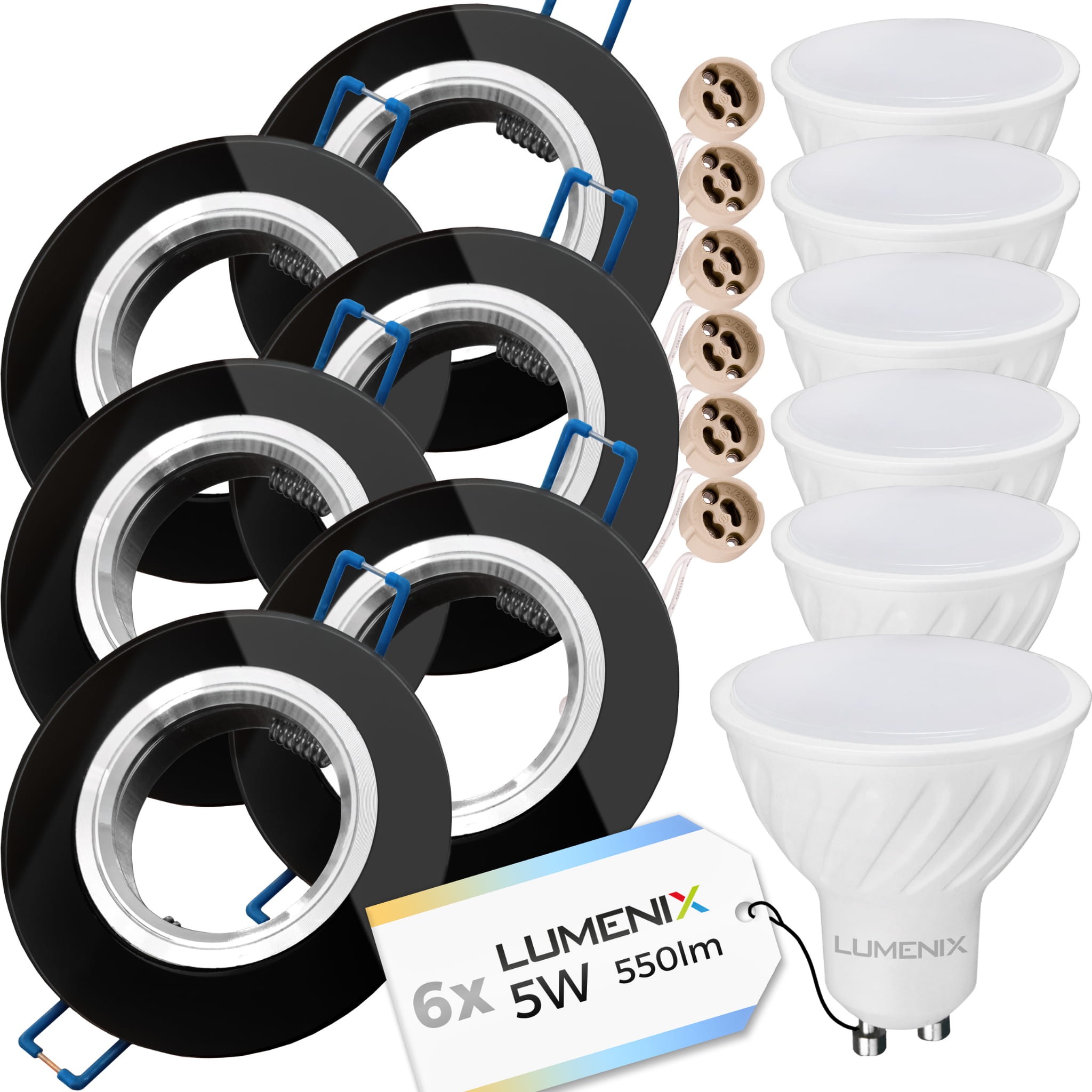 6x Zestaw oprawa okrągła szklana czarna + GU10 5W + gniazdo GU10