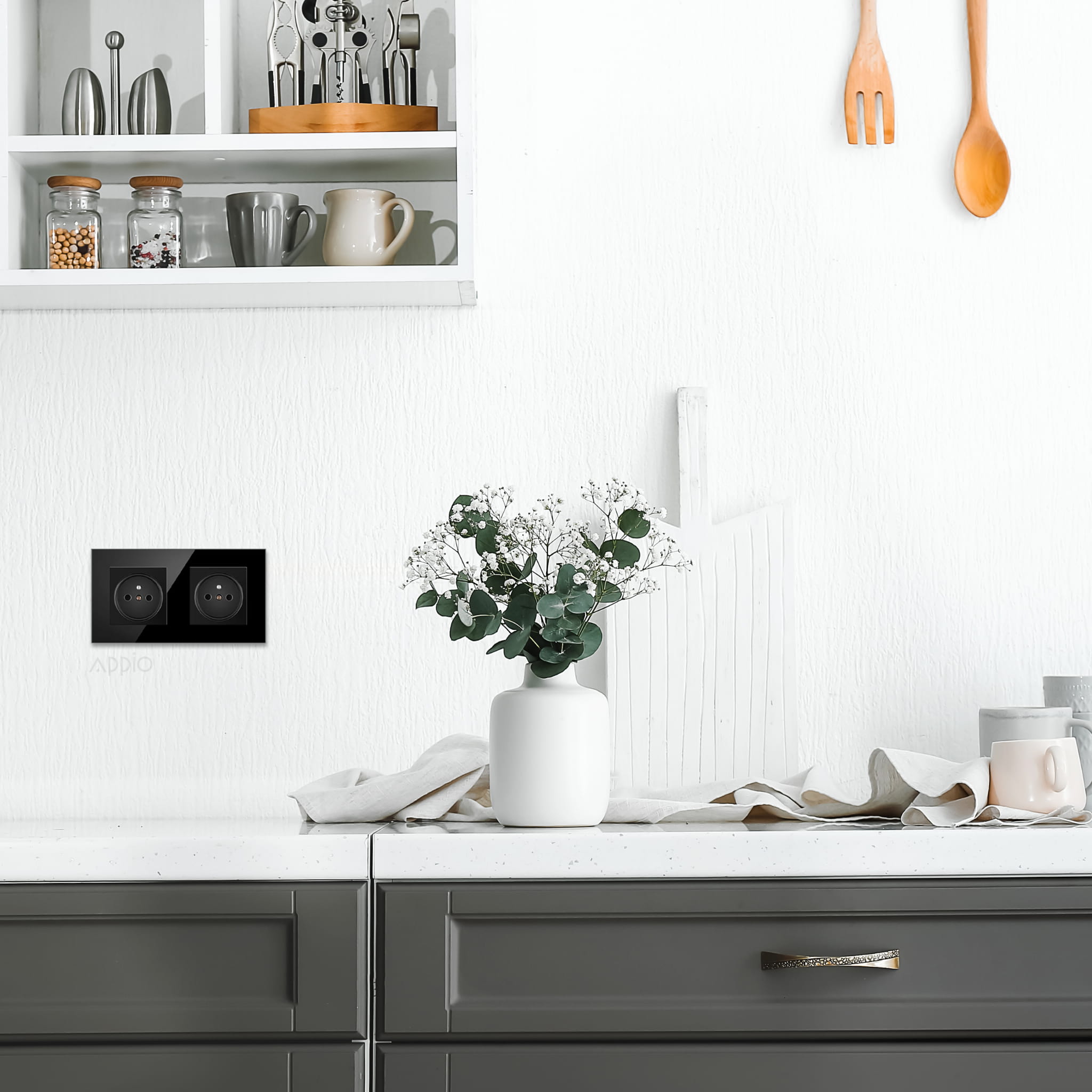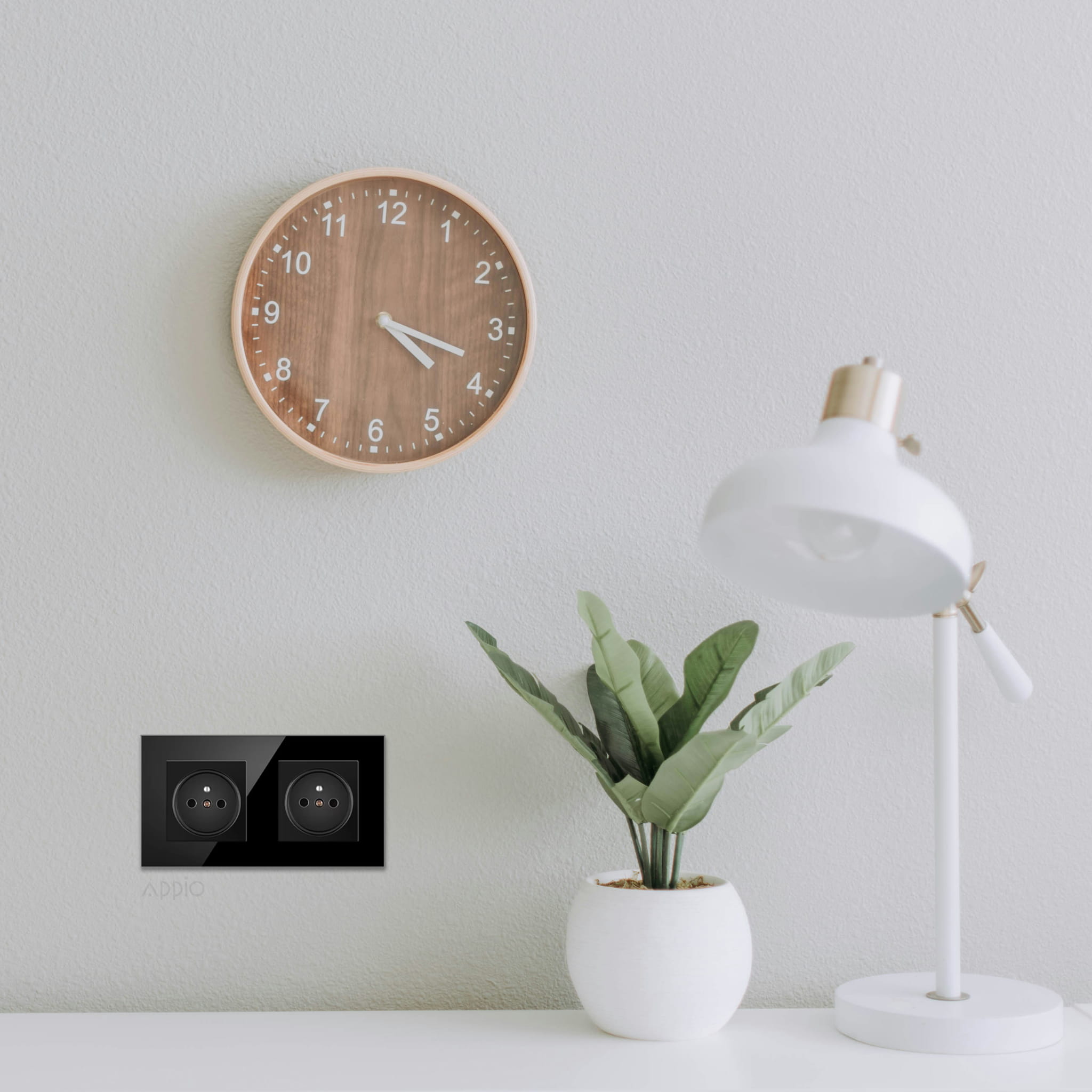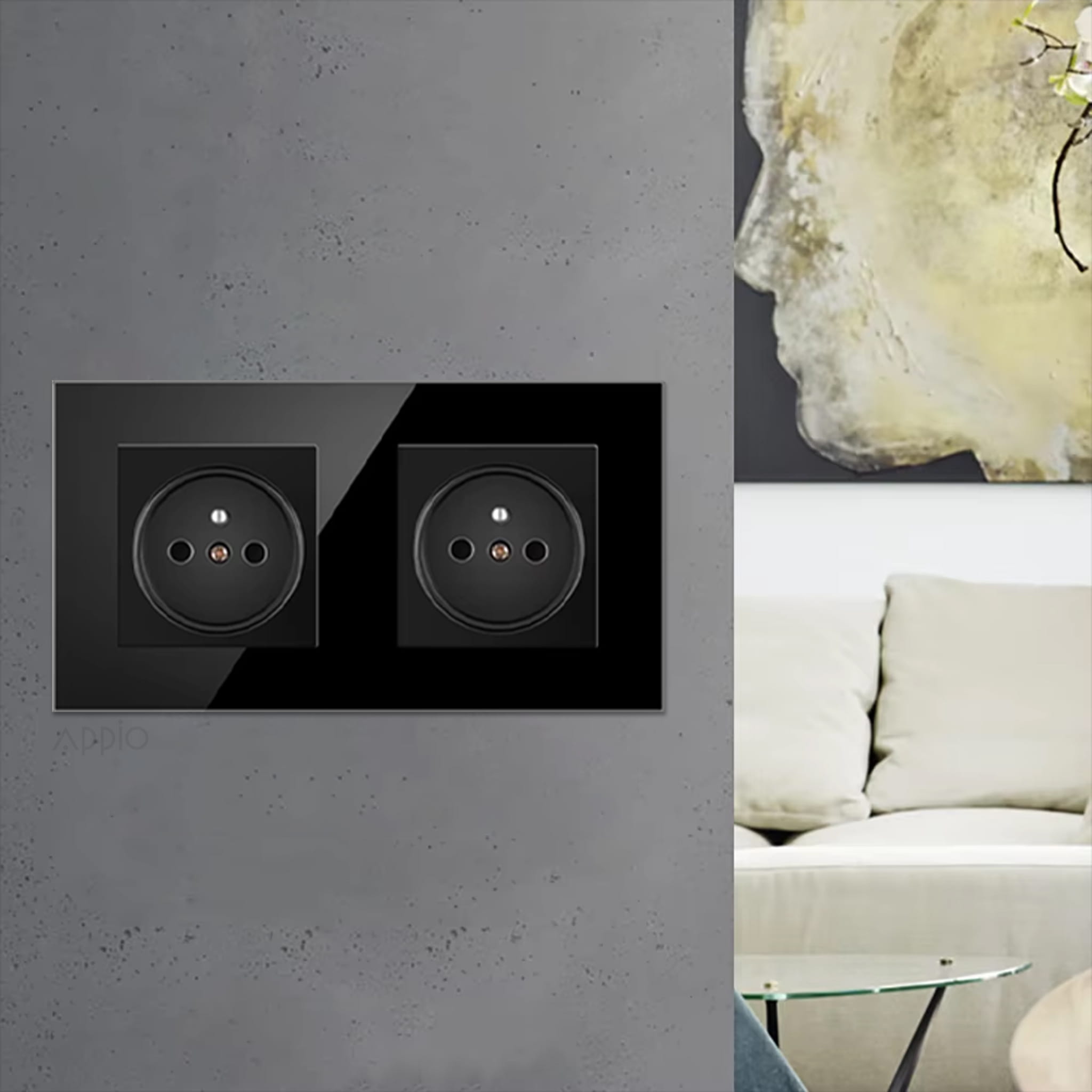 Nowoczesne, minimalistyczne gniazdko ze szklaną ramką. Gniazdko wykonane z wysokiej jakości materiałów, łatwe w montażu, odporne na uszkodzenia.