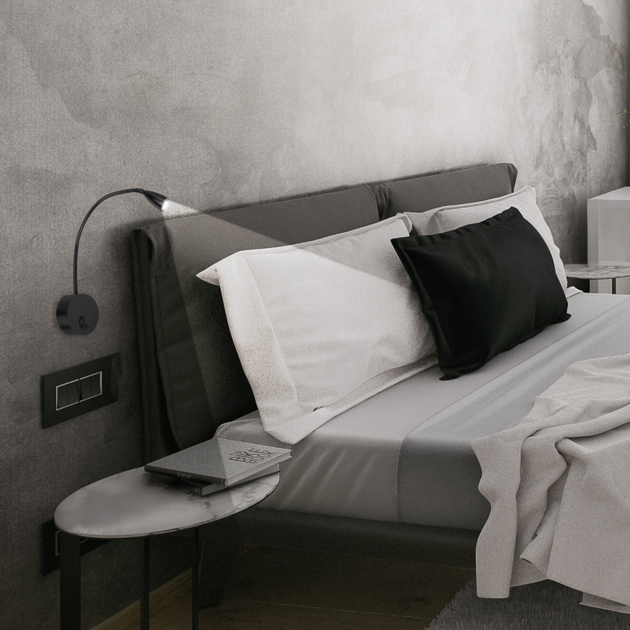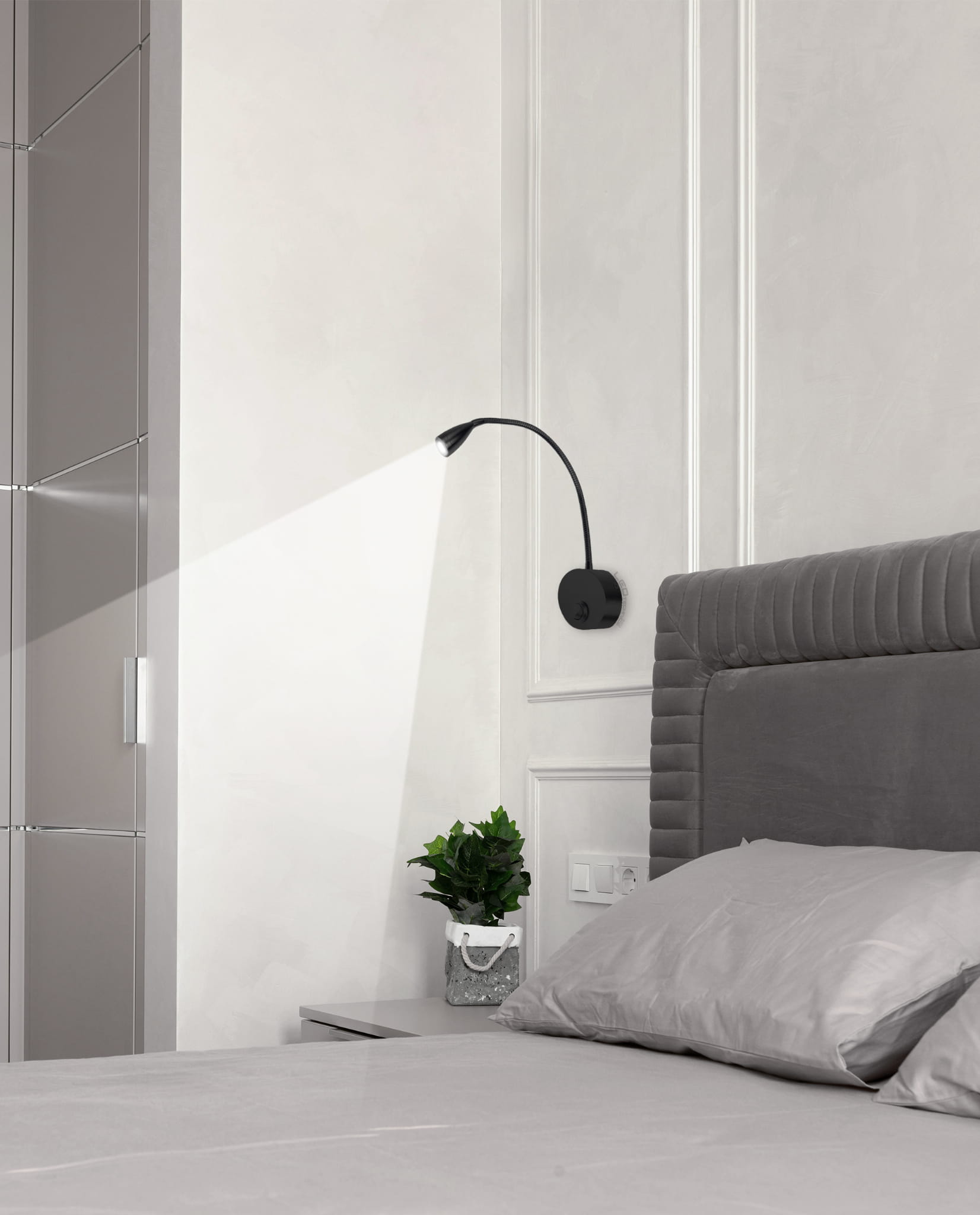 Nowoczesna, ponadczasowa lampka ścienna. Prosty kształt oraz wbudowane diody LED znajdą szerokie zastosowanie, m.in. jako oświetlenie przy łóżku. Elastyczne ramię lampki pozwoli na dostosowanie padania oraz mocy światła do własnych potrzeb. Kolejnym atutem lampki jest włącznik na podstawie, dzięki czemu można uruchomić światło bez konieczności podchodzenia do głównego włącznika światła.