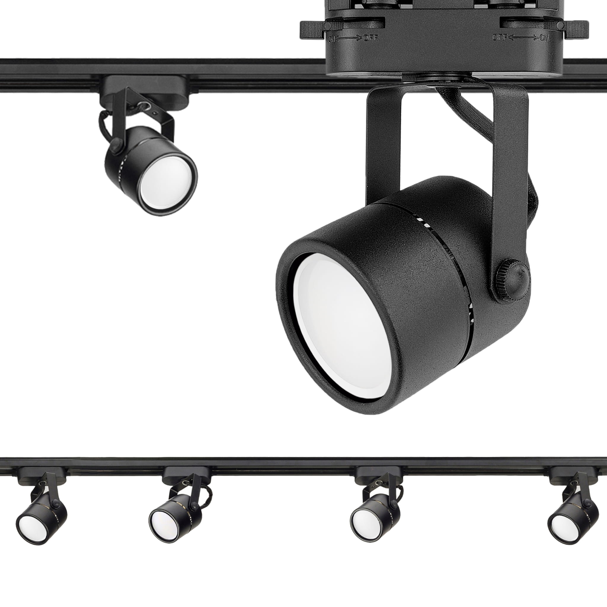 Kompletny zestaw oświetlenia szynowego przeznaczony do montażu sufitowego, idealny do nowoczesnych wnętrz mieszkalnych oraz przestrzeni komercyjnych. System składa się z dwóch szyn o długości 1 metra, czterech regulowanych spotów GU10.