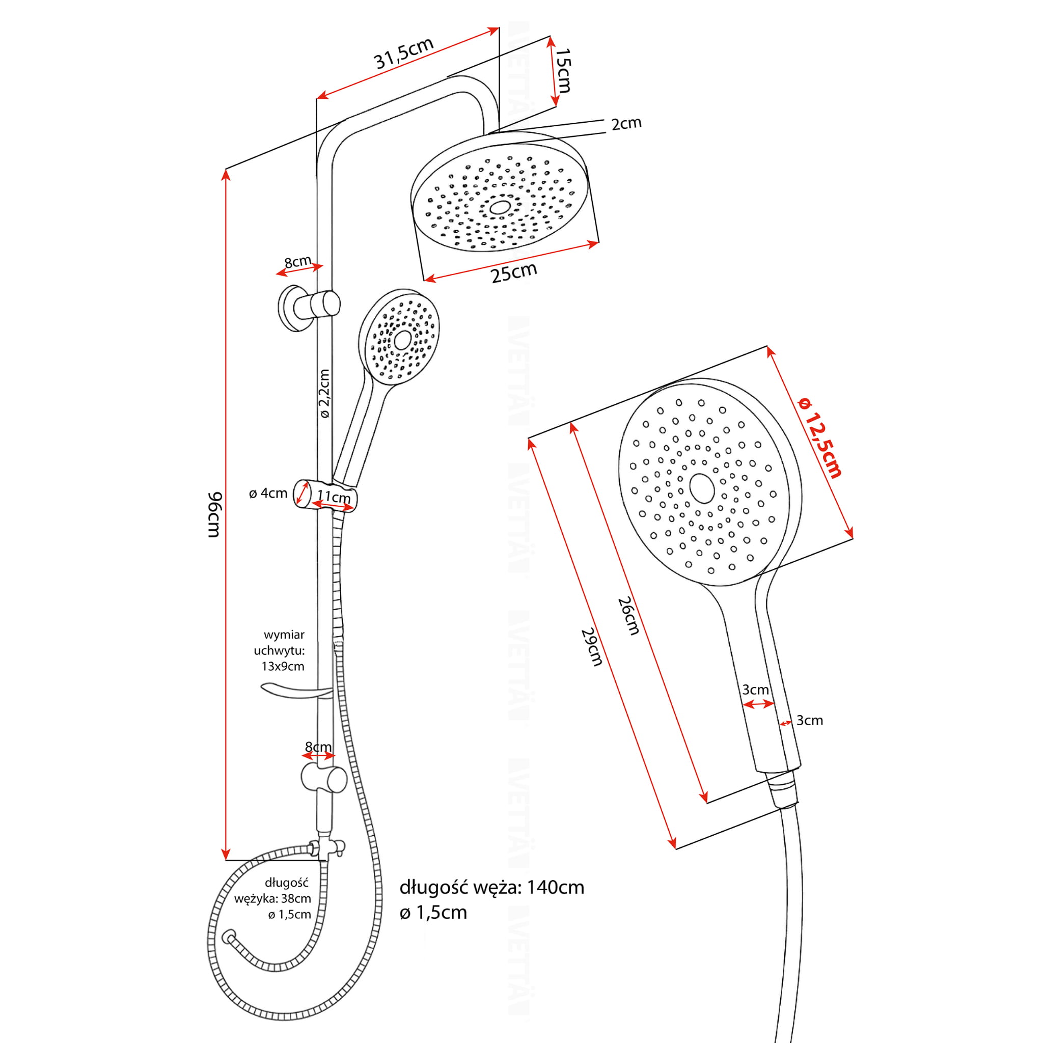 DESZCZOWNICA Zestaw prysznicowy Natrysk Prysznic Słuchawka Półka VETTÄ