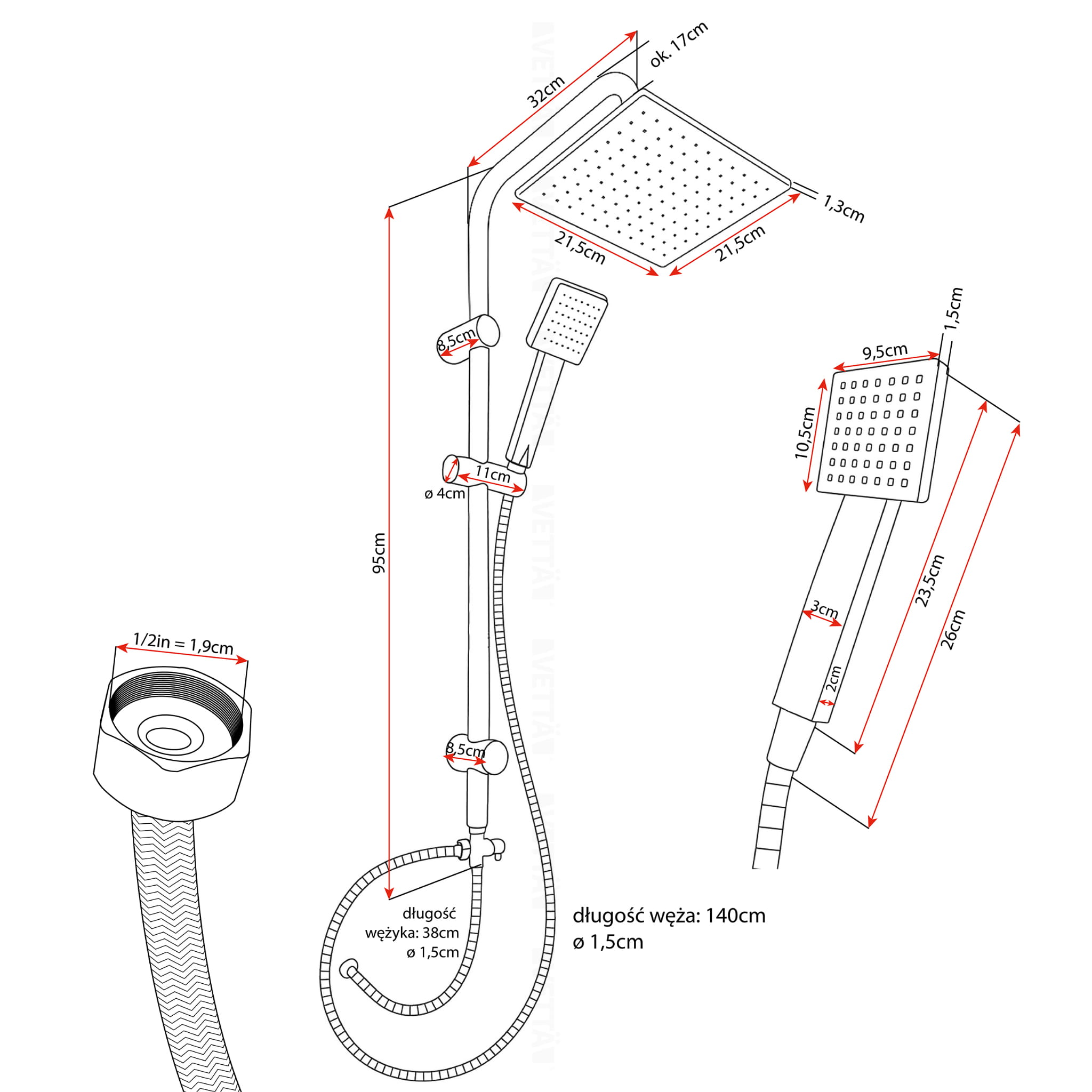 DESZCZOWNICA Zestaw prysznicowy chromowy Natrysk Prysznic Słuchawka VETTÄ