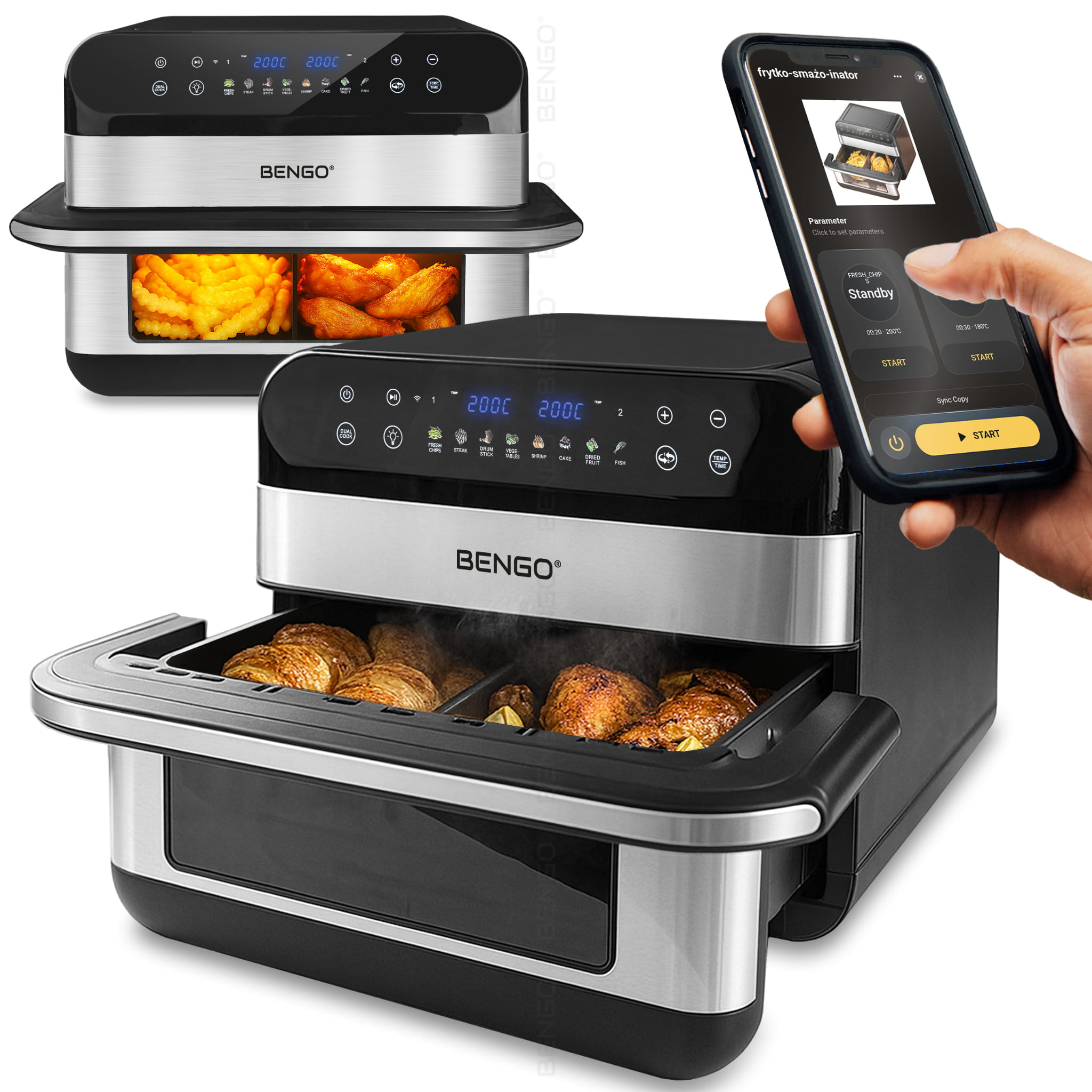 Frytkownica BENGO® została wyposażona w moduł łączności ze smartfonem i obsługuje aplikację TUYA Smart – lidera wśród systemów automatyki domowej. Dzięki temu możesz: