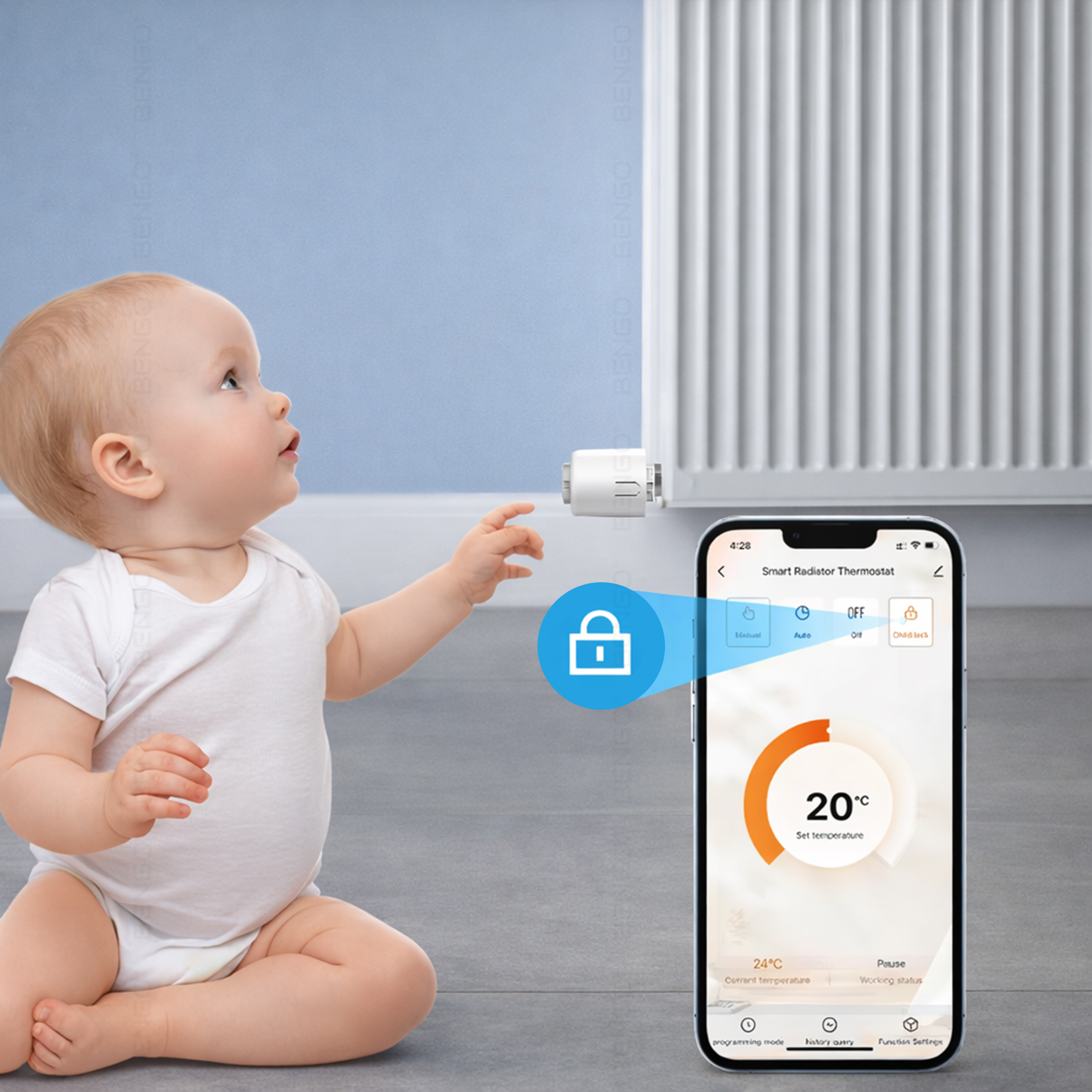 Funkcja Child Lock chroni ustawienia przed przypadkowymi zmianami, np. przez dzieci. Dodatkowo głowica obsługuje sterowanie głosowe oraz zapewnia dostęp do danych historycznych w aplikacji, co umożliwia dokładną analizę zużycia energii. Dzięki funkcji Smart Scenes można tworzyć inteligentne scenariusze, które automatycznie dopasowują temperaturę do różnych aktywności w ciągu dnia.