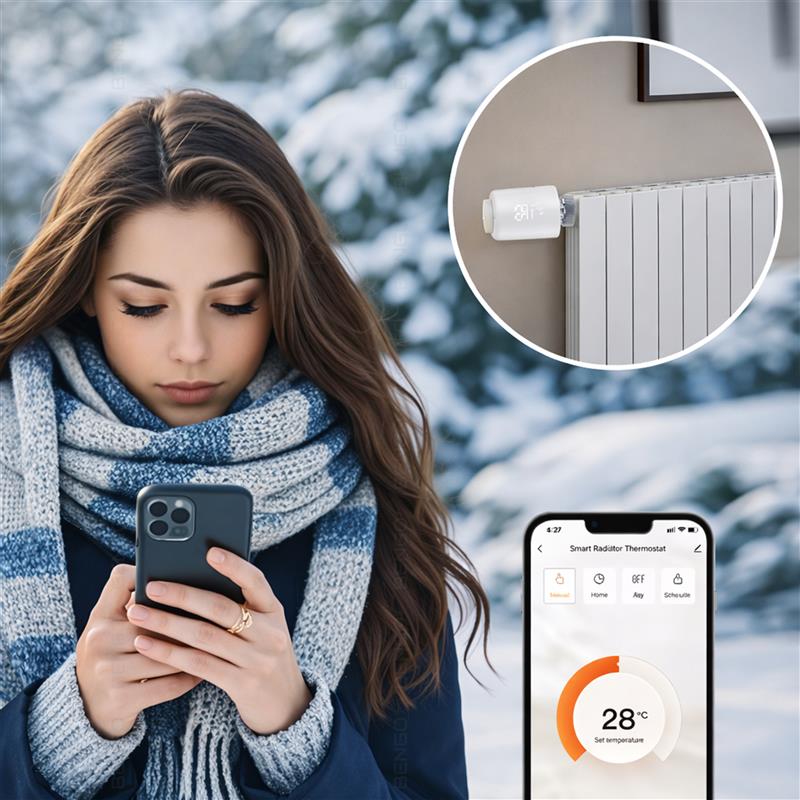 Głowica termostatyczna TRV umożliwia kontrolę temperatury z dowolnego miejsca na świecie. Dzięki bezprzewodowej łączności Zigbee użytkownicy mogą w prosty sposób regulować ustawienia ogrzewania za pomocą aplikacji mobilnej. To rozwiązanie zapewnia pełną wygodę i elastyczność — pozwala zarządzać temperaturą w domu zarówno z pracy, w trakcie podróży, jak i bez wychodzenia z łóżka.