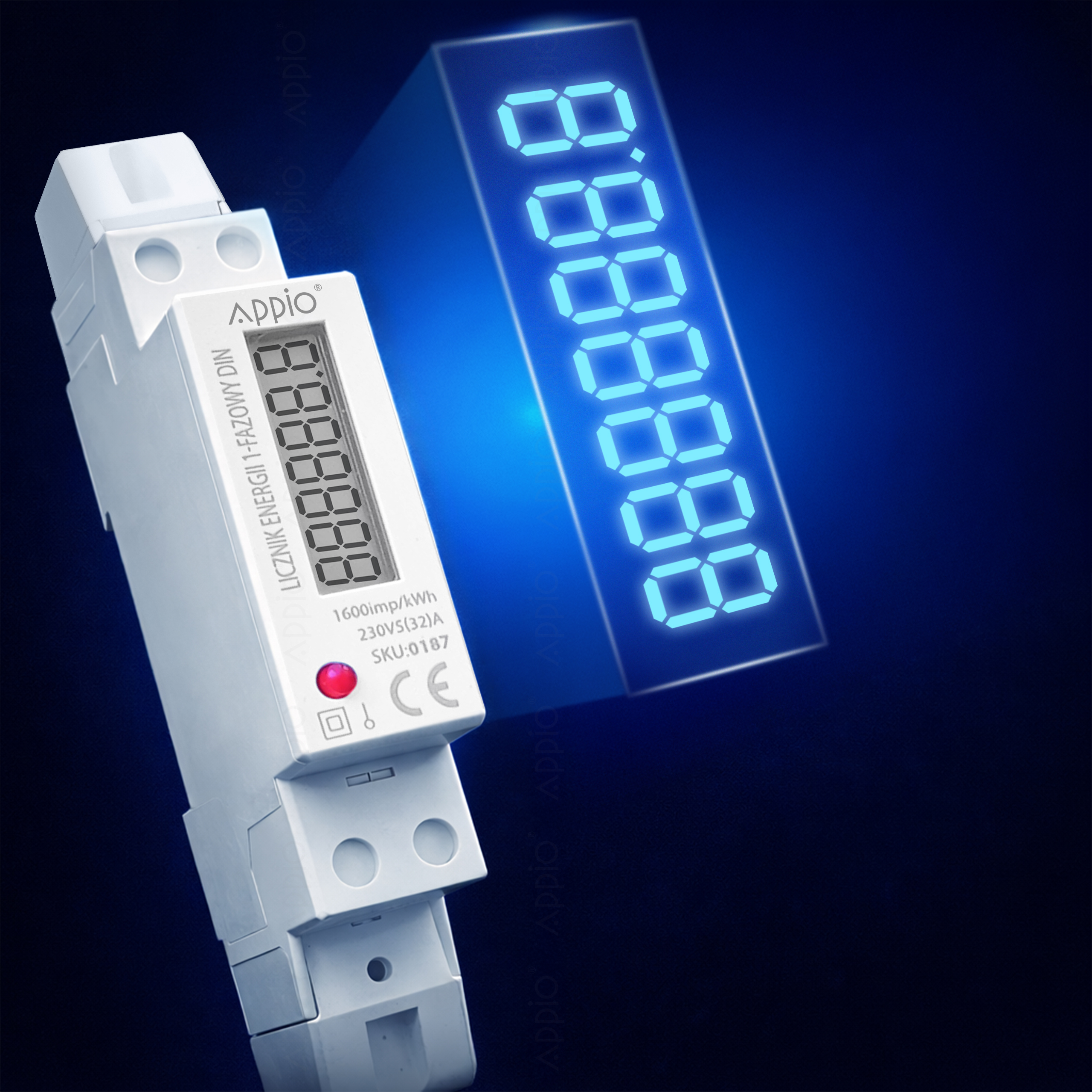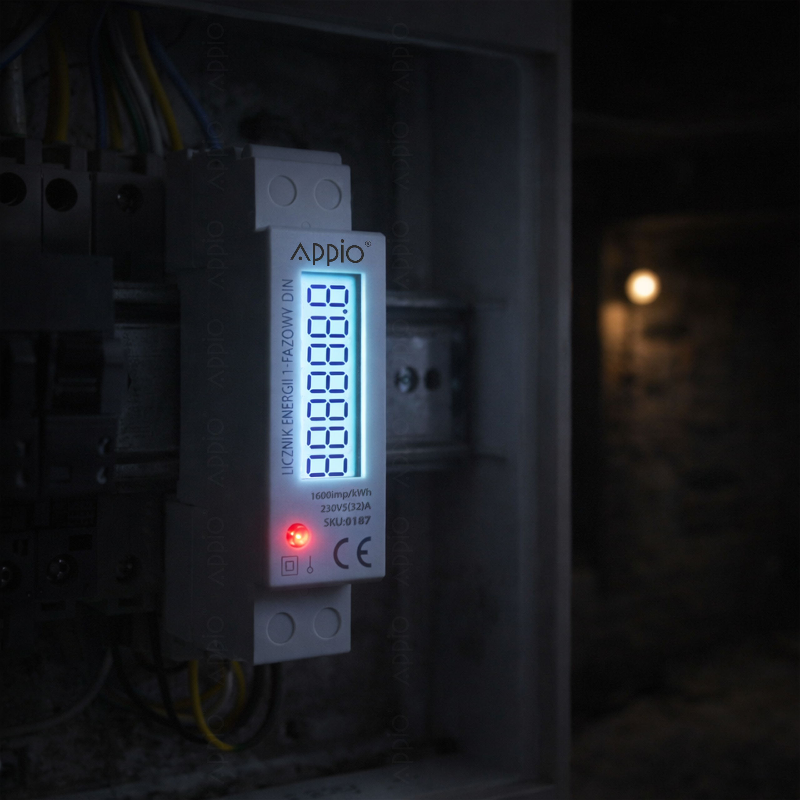 Duży wyświetlacz LCD prezentuje wartości w kWh w formacie 5+2 cyfr, a dioda LED błyska zgodnie z aktualnym poborem – umożliwia natychmiastową identyfikację zużycia energii.