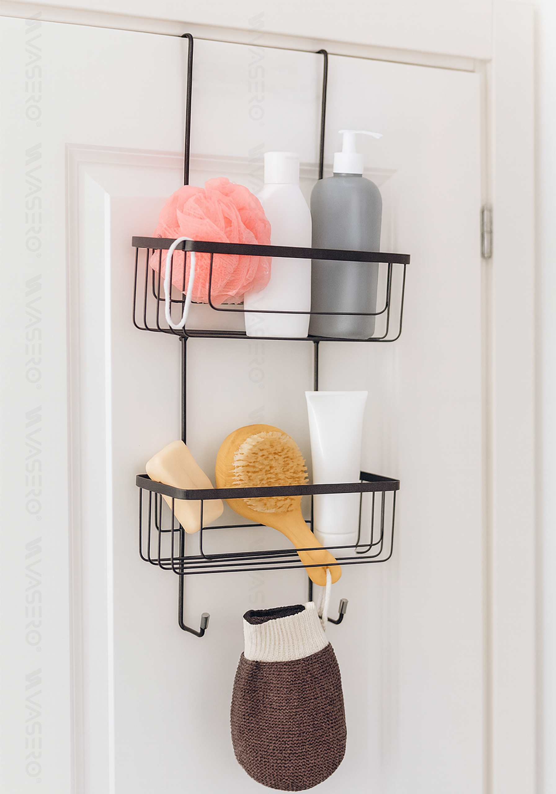 Dodatkowo półka wyposażona jest w 2 praktyczne uchwyty, na których możesz zawiesić np. myjkę, pumeks itp.