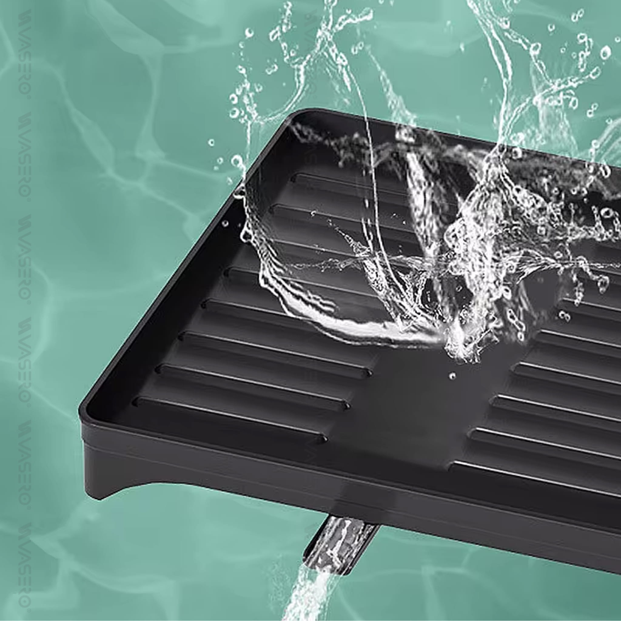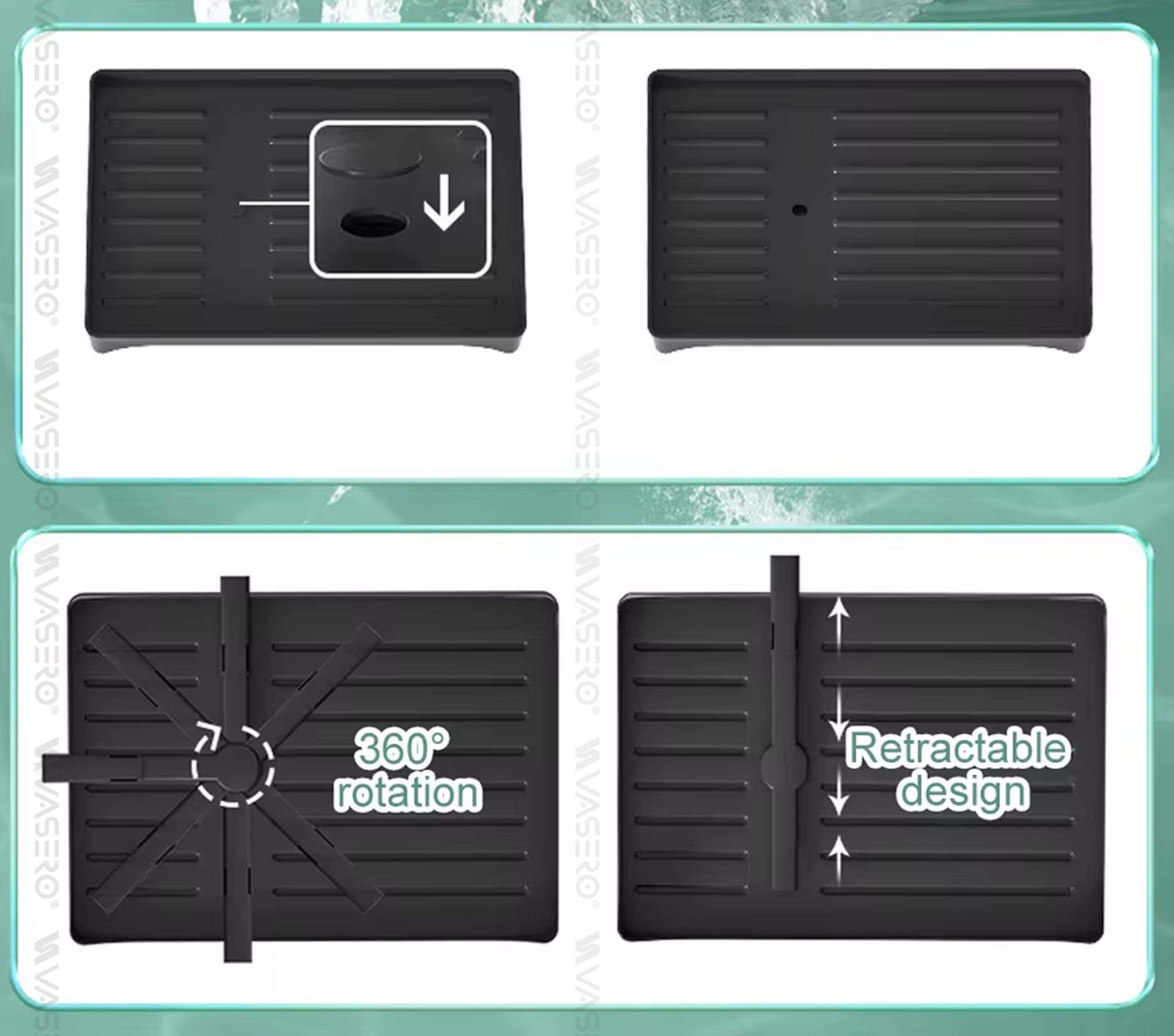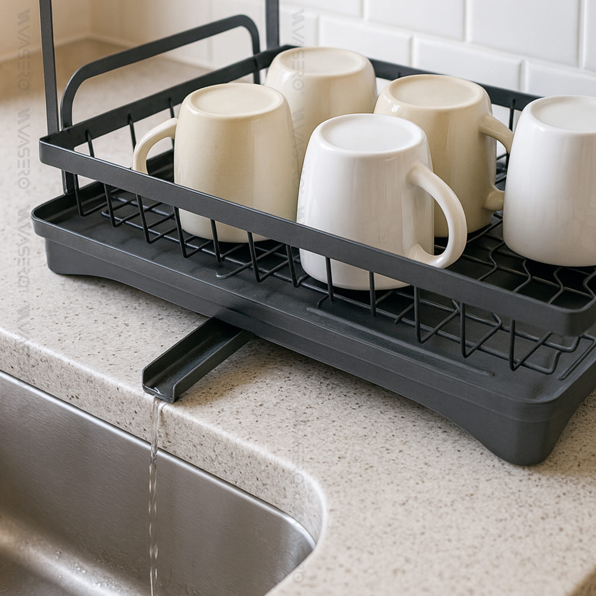 - Dzięki obrotowemu odpływowi 360°, suszarka skutecznie odprowadza wodę prosto do zlewu, eliminując mokre plamy na blacie