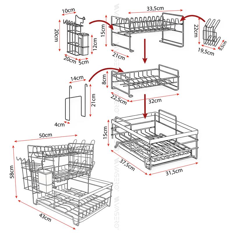 ✔️ Stabilna, metalowa konstrukcja – suszarka została wykonana z wysokiej jakości metalu, który zapewnia nie tylko nowoczesny wygląd, ale przede wszystkim wyjątkową wytrzymałość. Bez trudu utrzyma cięższe elementy, takie jak garnki, talerze czy kubki, zachowując pełną stabilność.