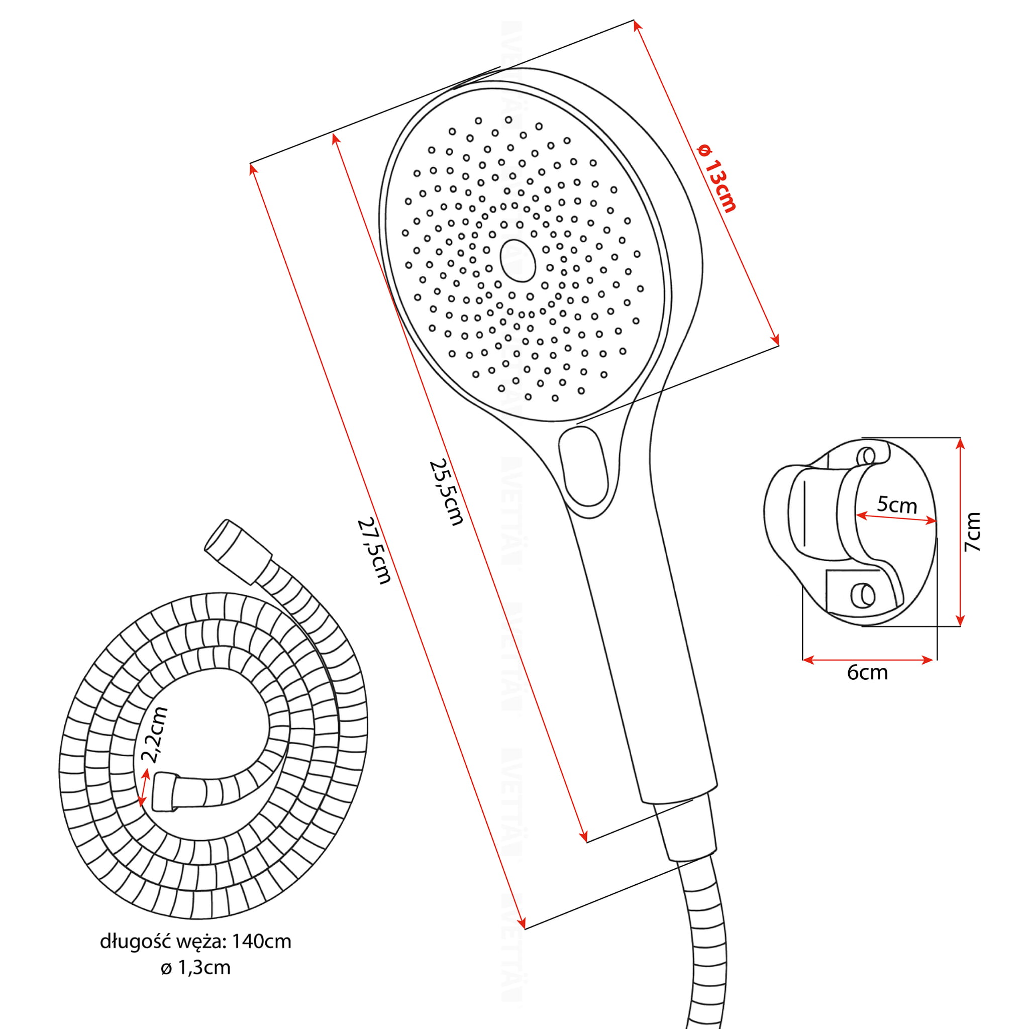 Zestaw prysznicowy słuchawki + wąż 1,5m + uchwyt