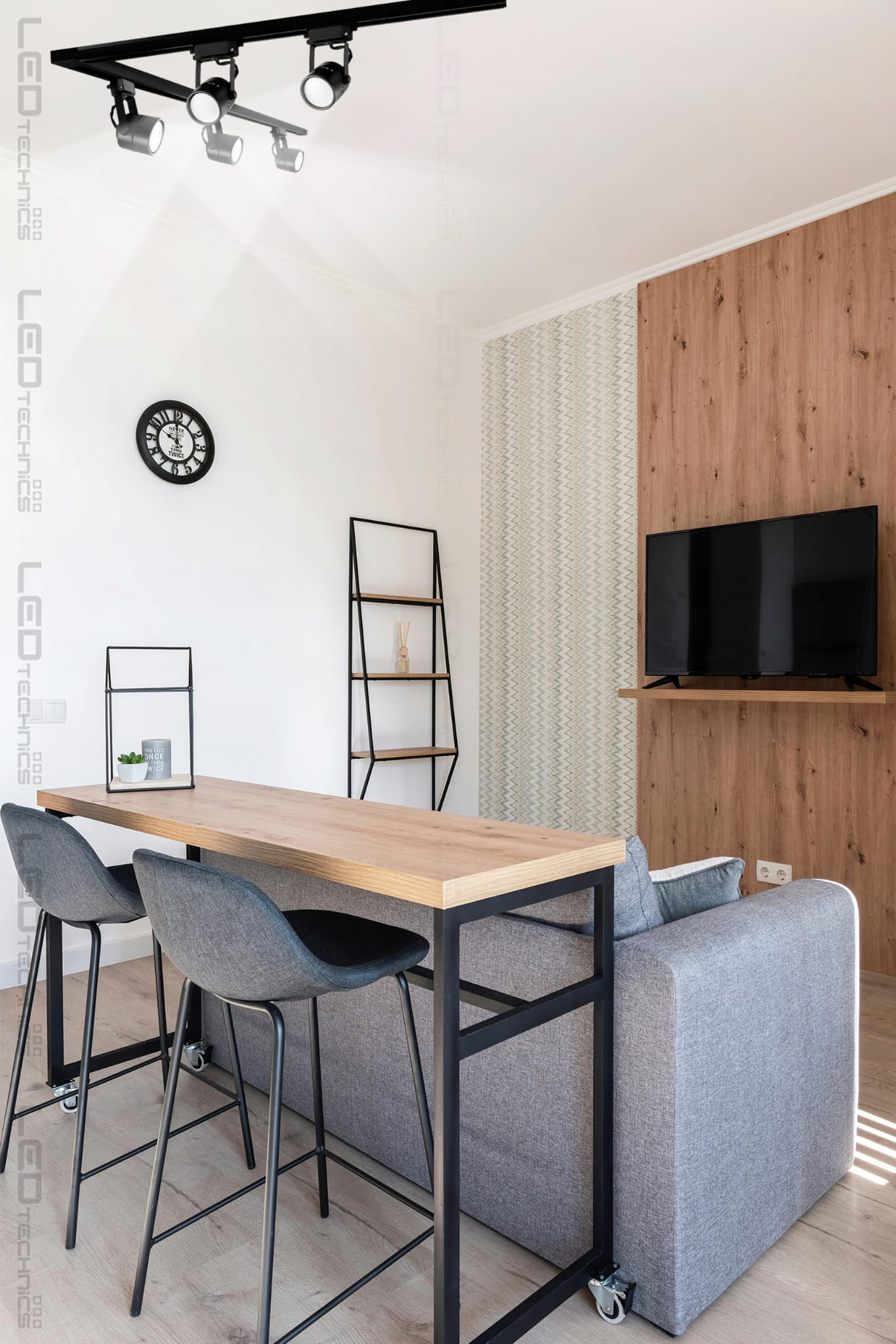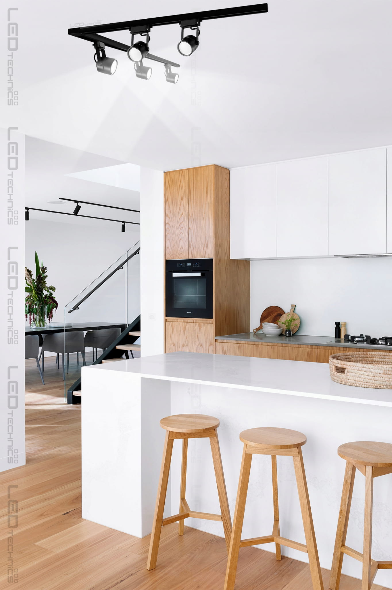 Dzięki zastosowaniu wymiennych źródeł światła GU10, użytkownik ma pełną swobodę w doborze mocy, barwy oraz kąta świecenia. Spoty można przesuwać wzdłuż szyn, obracać oraz regulować kierunek światła, co pozwala precyzyjnie doświetlić wybrane strefy pomieszczenia.